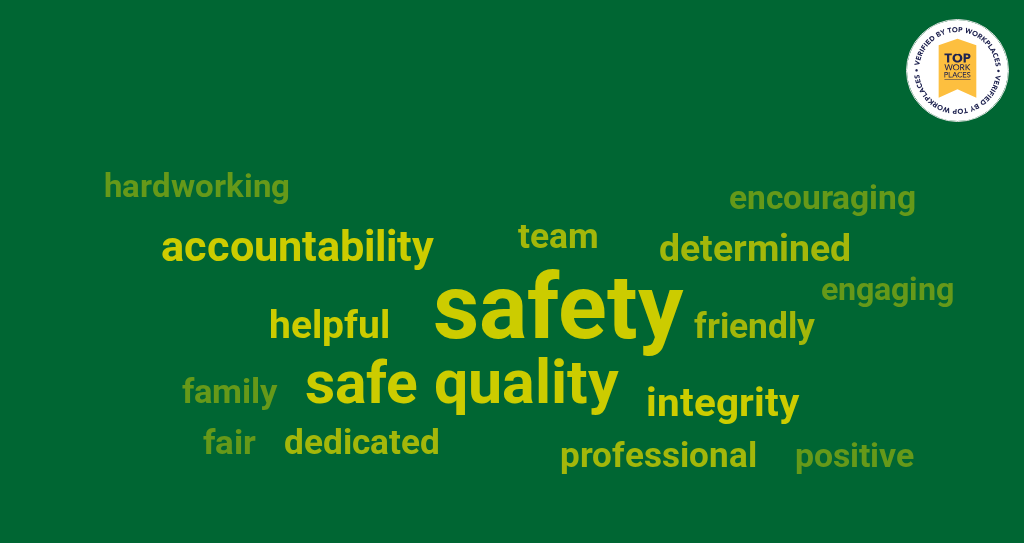The word cloud created from survey responses illustrates how our employees describe the Lewis culture, with themes that reflect our core values of safety, quality, integrity, and accountability. These values are deeply embedded in our work and guide our decisions, behaviors, and interactions both inside and outside the organization.